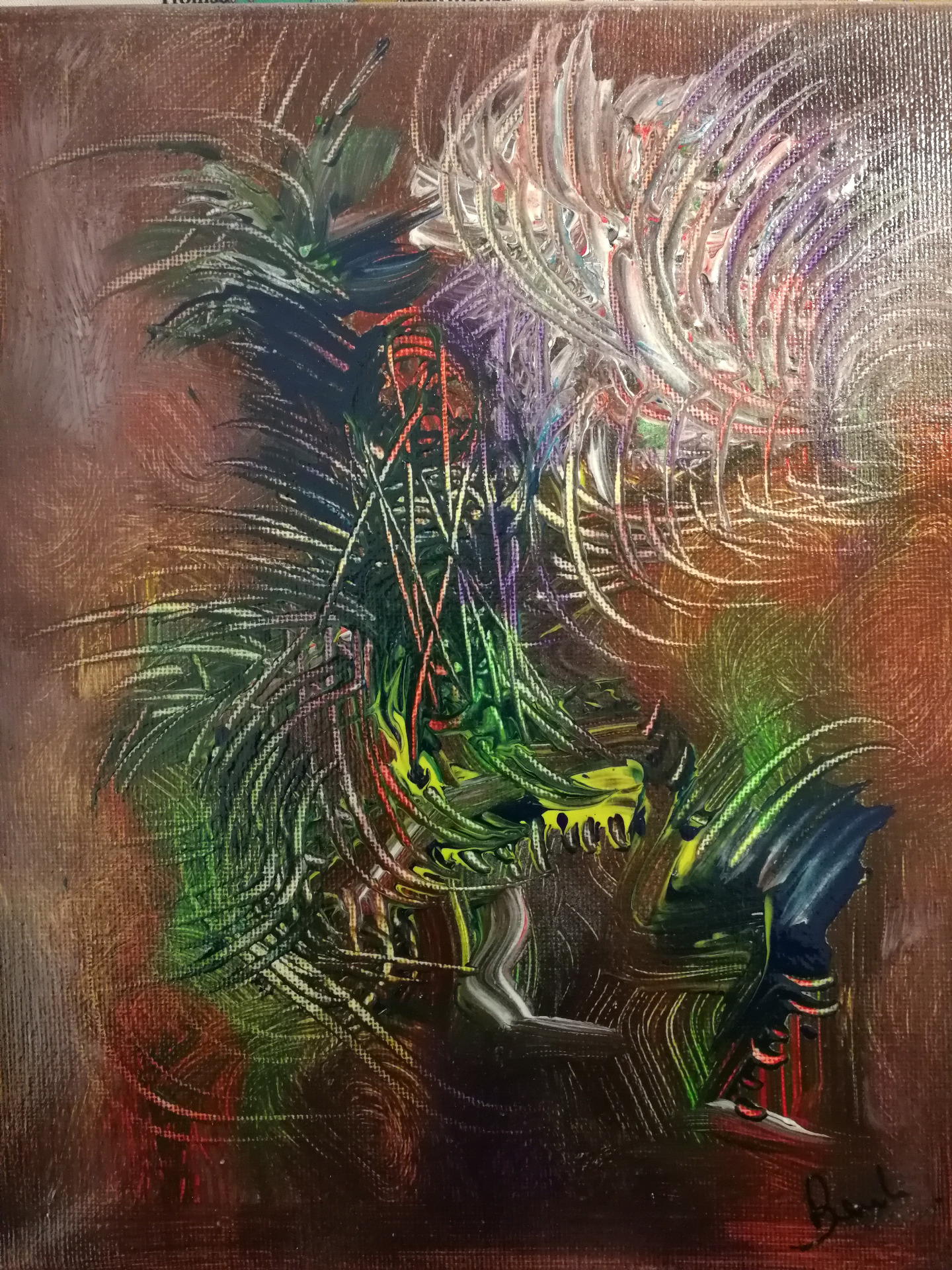 Suggestione: Si avverte una tensione drammatica, forse spirituale, come se l'artista volesse esprimere uno scontro tra forze visibili e invisibili, tra ordine e disordine. Alcuni elementi ricordano forme alate o tentacolari, rendendo l'opera a tratti biomorfa, a tratti visionaria.